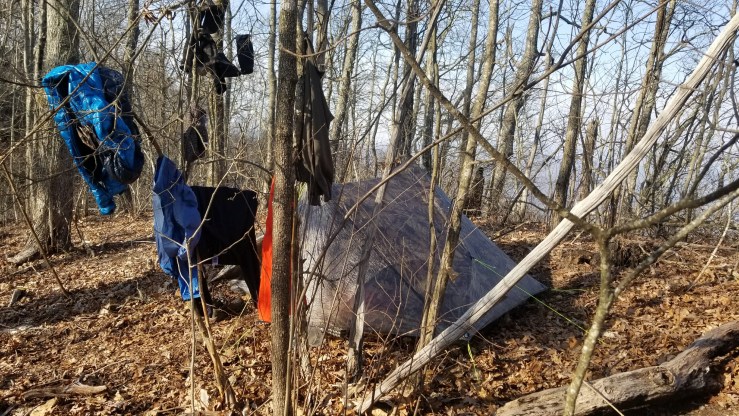Did not feel like staying in a established campsite, so I just set up my tent on a ridge in the woods. Have some day light left, so giving some clothing time to air out a little.
