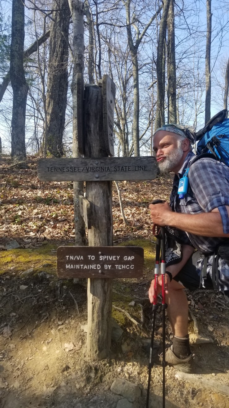 I am two miles outside of Damasus, Virginia tonight. That’s right, I entered Virginia tonight and left Tennessee behind. Tennessee was good to me. Below is me kissing the State line crossing. At this stage of the hike, I have walked through Georgia, North Carolina and Tennessee.