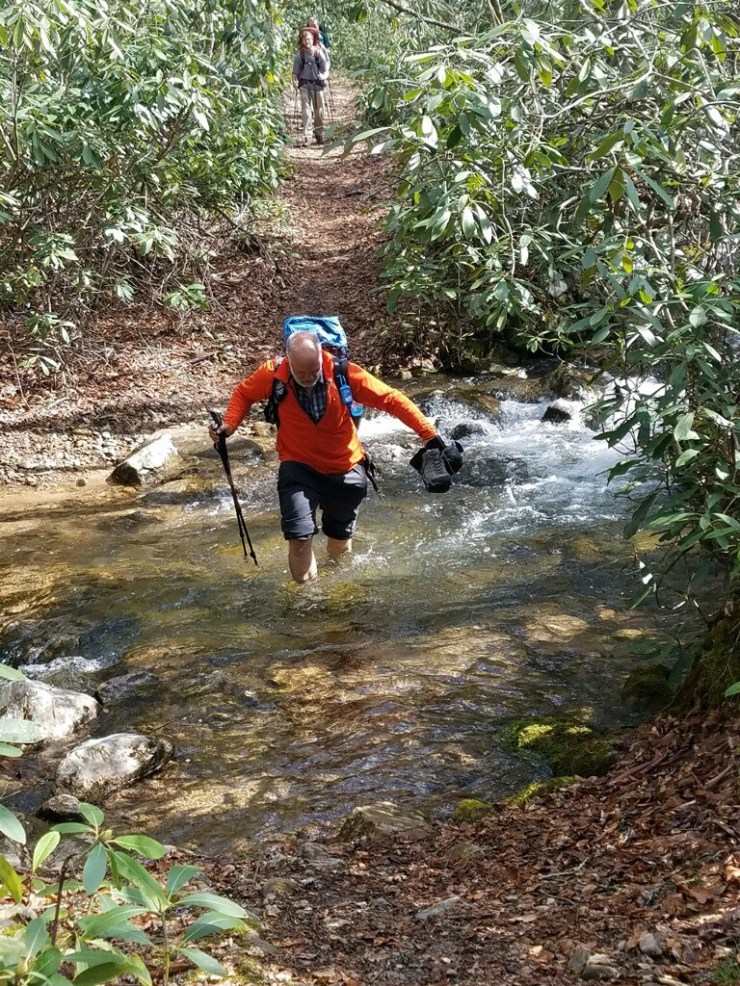 The water in the creeks was really down today, but still above normal flow. With two days of heavy rain, some creeks on the trail are normally a ankle deep, but are now knee deep. Yesterday, they were waist deep. Came across a knee deep creek I had to cross today, so I rolled up my pants, took my shoes and socks off and waded through the cold water in sandals. Dried the feet off and put things back on.