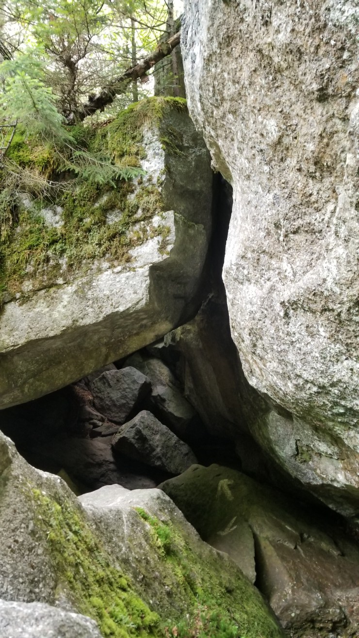 After getting warmed up, I entered Mahoosuc Notch. It is a deep mile long valley with sheer cliff walls, filled with boulders that were dumped there during the last ice age. The boulders are car and house sized generally. I had to put away my trekking poles, as all hands, feet, the rear and mind were needed to crawl over, around, under, between the boulders along with a few mountaineering/caving moves. It took me about two hours to move a mile here. It was fun, but a slow going challenge. There was still a lot of ice I could see and it was like being in a refrigerator. Some times I was laughing and other times cursing. It was fun though.